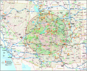 ラスベガスがあるのが、地図の円すぐ西側です。つまり、ラスベガスからみて東側の砂漠に広がる国立公園や州立公園を回っていくことを「グランドサークル」といいます。