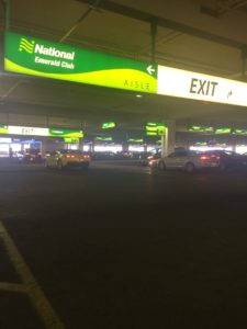 鍵をもらったら、駐車場へ行きます。駐車場は広々しています。このようにレンタカー会社(AVISやDOLLARなど)ごとに区画が決まっていますので、自分が借りたレンタカー会社の区画に行きましょう。