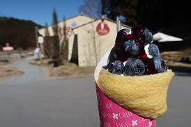 写真のクレープはシャリシャリに凍ったあまーいブルーベリーが沢山載り、ソフトクリームやホイップクリームと一緒になって、口の中に入れた瞬間に忘れられない美味さ!