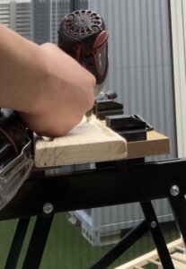 ヤスリがけは結構量があるのでサンダー(電動工具)があると便利です。子供が使うので角を丸くするのと、ささくれが出ないように細心の注意が必要です。荒い(番号が若い)ものから始めて、徐々に番号を増やして400番で仕上げました。ここをサボると仕上がりの見た目が悪くなるので注意しましょう。木目に沿ってやるのが原則です。